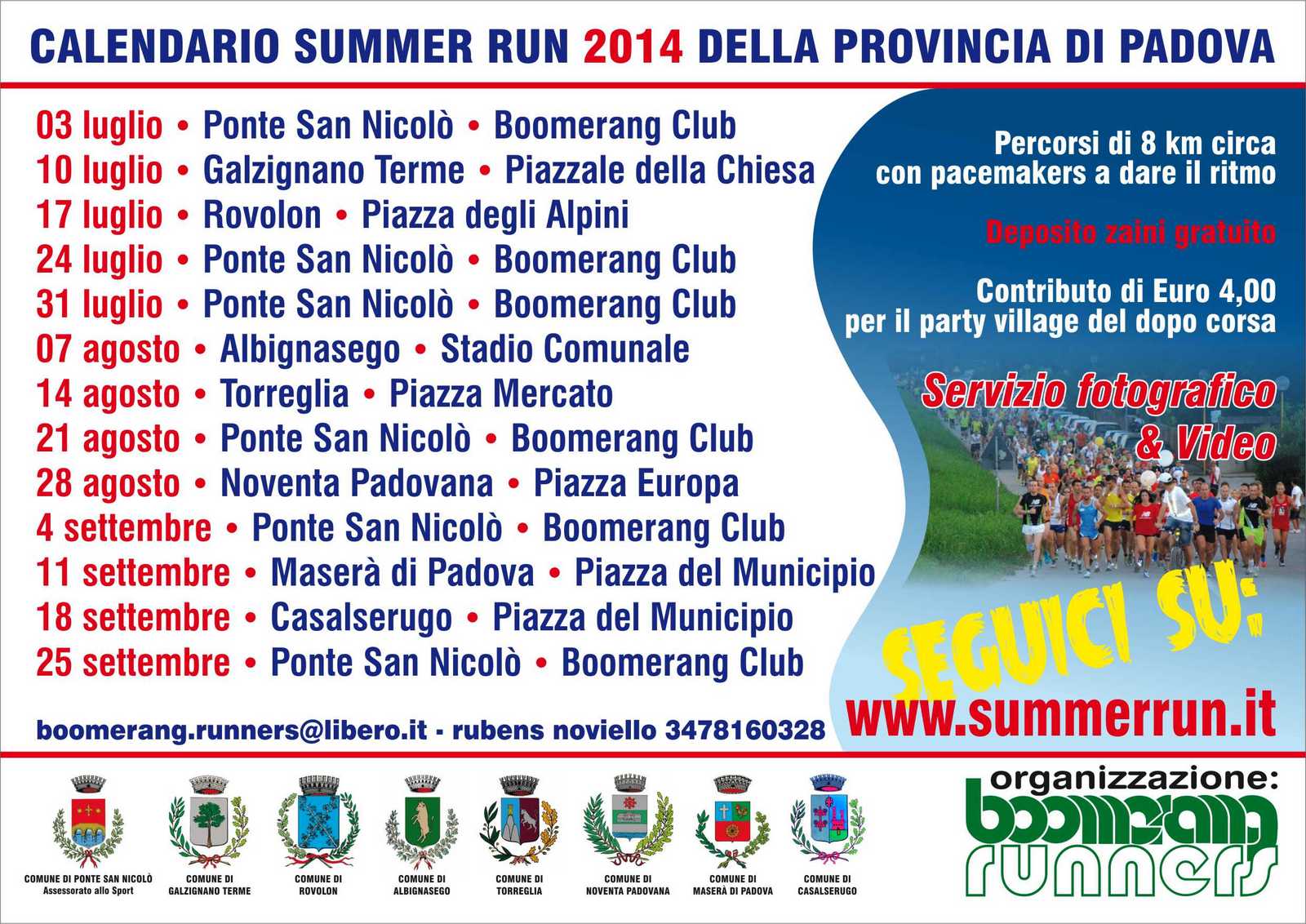 13ª edizione di questo ciclo di appuntamenti del giovedì sera. Il clima incerto e le temperature poco estive, quest’anno non hanno favorito i tuffi in piscina. In compenso l’appetito non è mai mancato. Con una lacrimuccia negli occhi vi annunciamo la fine della Summer Run 2014… Ma sorridete! Dal prossimo giovedi, 2 ottobre, alla stessa ora e con la stessa formula (…o quasi…) comincia a Bagnoli di S. il ciclo dell'”Aspettando la StrapadovaViva”. Quattro allenamenti in luoghi diversi che non avete ancora calpestato. Vi ricordiamo che con giovedì 2 ottobre i comitati Fiasp e Marciapadova, organizzatori della Strapadovavia, con la collaborazione del Comune di Padova e dell’Associazione Veneta per la lotta alla Fibrosi Cistica, iniziano l’immane lavoro di raccolta fondi da destinare alla ricerca per sconfiggere la malattia e all’assistenza dei malati di Mucoviscidosi. Non vanificate i nostri e i vostri sforzi! Vi aspettiamo numerosi… e col sorriso sulle labbra, come sempre, perchè il divertimento continua!!!