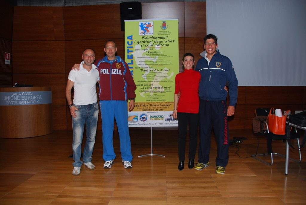 È stata una serata molto interessante quella che ha visto lunedì 12 aprile iniziare il ciclo di tre appuntamenti della edizione 2010 del progetto “Educhiamoci! I genitore degli atleti si confrontano” organizzata da Calciatletica nella persona di Rubens Noviello. Il sindaco di Ponte San Nicolò, Enrico Rinuncini, ha portato i saluti e i complimenti della amministrazione comunale e della cittadinanza.Ospiti della Sala Civica “Unione Europea” nel Comune di Ponte San Nicolò, che patrocina l’iniziativa, sono stati Paolo Venturini (ultramaratoneta) e Alessandro Fabian (campione del mondo di Duathlon e campione Italiano di Triathlon). Relatore Stefania Franzoni, psicologa dello sport, che ha parlato di Resilienza, ovvero la capacità che ogni individuo ha di continuare a lottare per raggiungere la meta che si prefigge, anche quando le difficoltà, la stanchezza e le avversità lo indurrebbero a rinunciare. Partendo dalla considerazione che questa caratteristica è particolarmente sviluppata negli atleti, la discussione si è allargata poi alla vita di tutti i giorni. La Dott. Franzoni ha proiettato alcune slide per sviluppare il tema in modo interessantissimo, ma è stato quando ha utilizzato i racconti del giovane Alessandro e del un po’ meno giovane Paolo, che la platea si è appassionata. Nella triplice veste di genitore, allenatore e atleta è stato chiamato in causa anche Rubens Noviello che dopo aver introdotto l’argomento della serata, ha risposto ad alcune domande.Molti i quesiti rivolti anche ai due atleti.